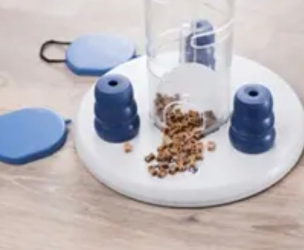 Vul elke verdieping van de toren met een lekkere snack voor jouw hond en vergeet niet om onder de blauwe kegels wat lekkers te leggen. Jouw hond kan een verdieping uit de toren halen door aan het touwtje te trekken. Daarop vallen de snacks naar de open onderkant waar jouw lieveling het lekkers op kan peuzelen. Dit is niet voor de beginner omdat hij al moet geleerd hebben om het object te onderzoeken en manipuleren. Beginners gooien makkelijk alles om, iets wat met deze gambling tower makkelijk gaat.