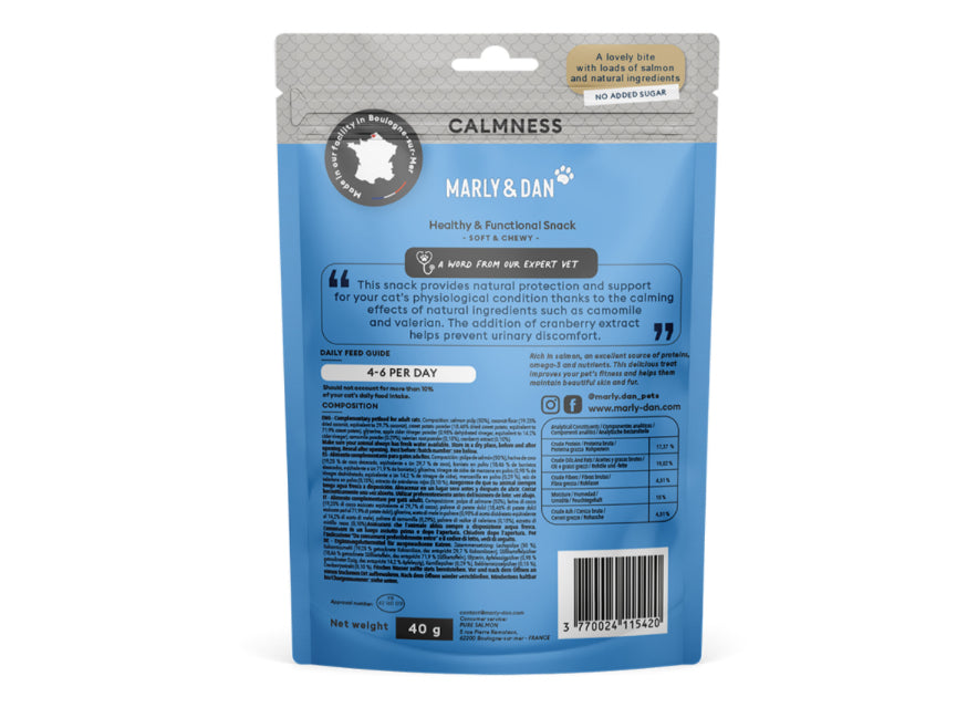 Deze snack biedt natuurlijke bescherming en ondersteuning voor de fysiologische conditie van je kat dankzij de kalmerende effecten van natuurlijke ingrediënten zoals kamille en valeriaan. De toevoeging van cranberry-extract helpt urinewegklachten te voorkomen.